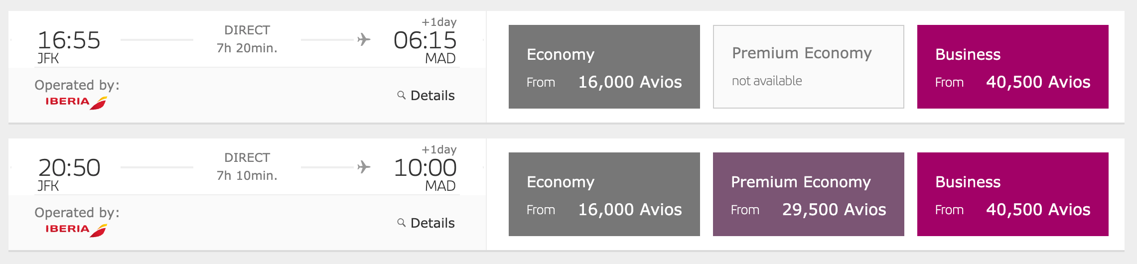 Remember how you can transfer Avios between airlines? That means you could buy Finnair Avios, transfer them to Iberia, and book this flight from New York to Madrid using 40,500 Iberia Avios and $126 in business class.
