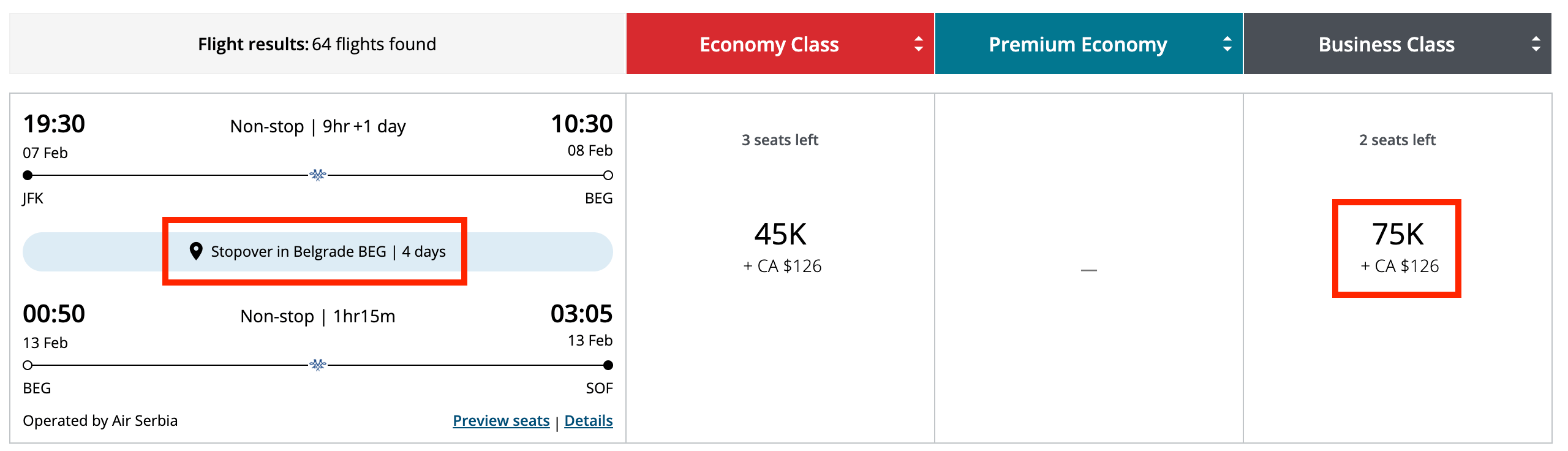 You get business class on both legs, plus four days in Belgrade before continuing on to Bulgaria.