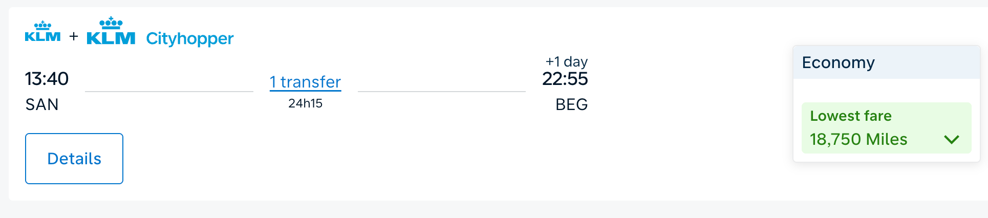 Even if you live out on the West Coast in a city like San Diego, you can transfer points from any U.S. bank and book a flight to Belgrade for as few as 18,750 miles in economy. š
