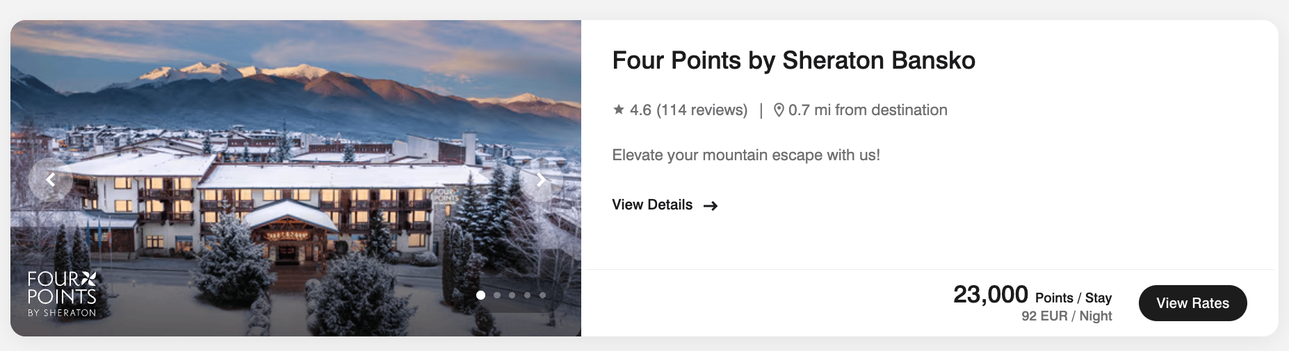 The Four Points by Sheraton runs about 23,000 Marriott Bonvoy points or around $100 per night, depending on the season.