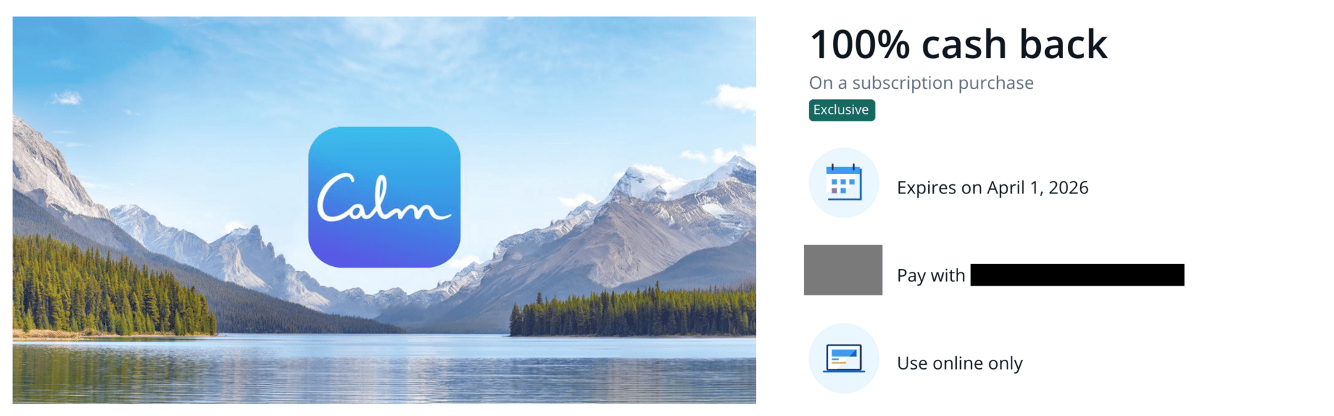 For example, right now I have an offer on the [[ chase-sapphire-reserve.name ]] to get 100% back at Calm.