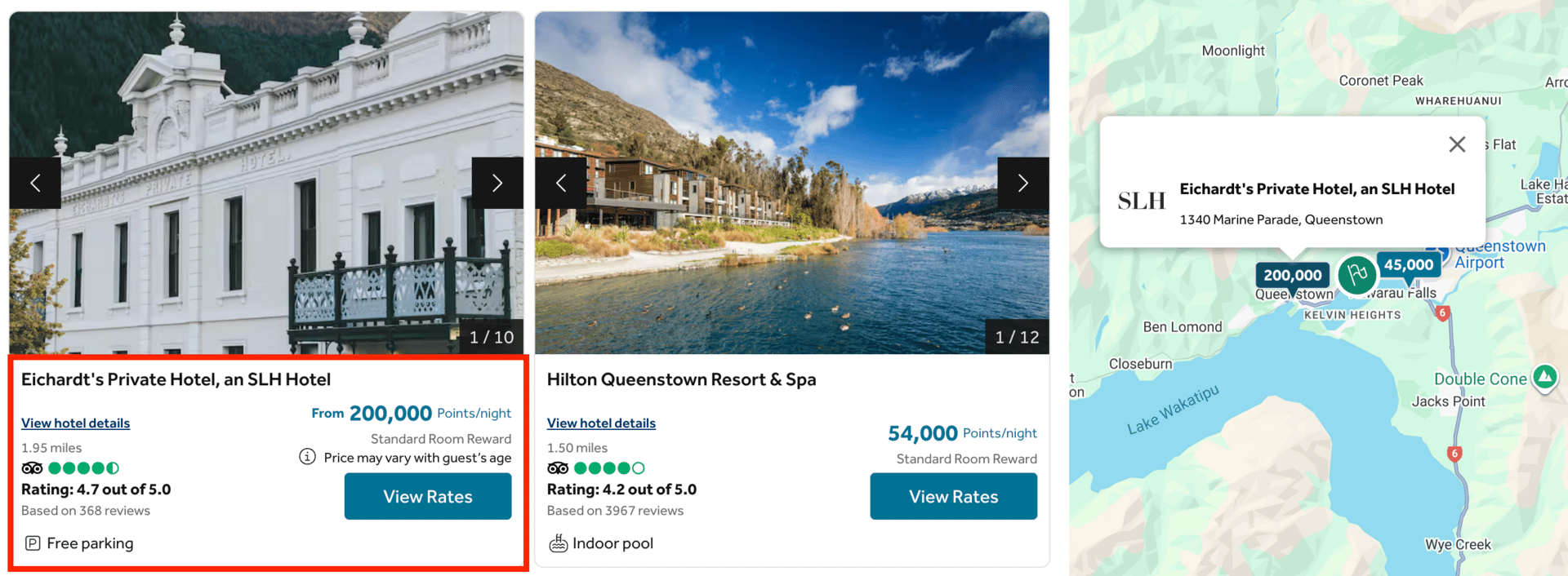 I used my Hilton FNAs earlier this year to stay at Eichardt’s Private Hotel in New Zealand, which costs 200,000 points per night (yes, even for a standard room). 👇