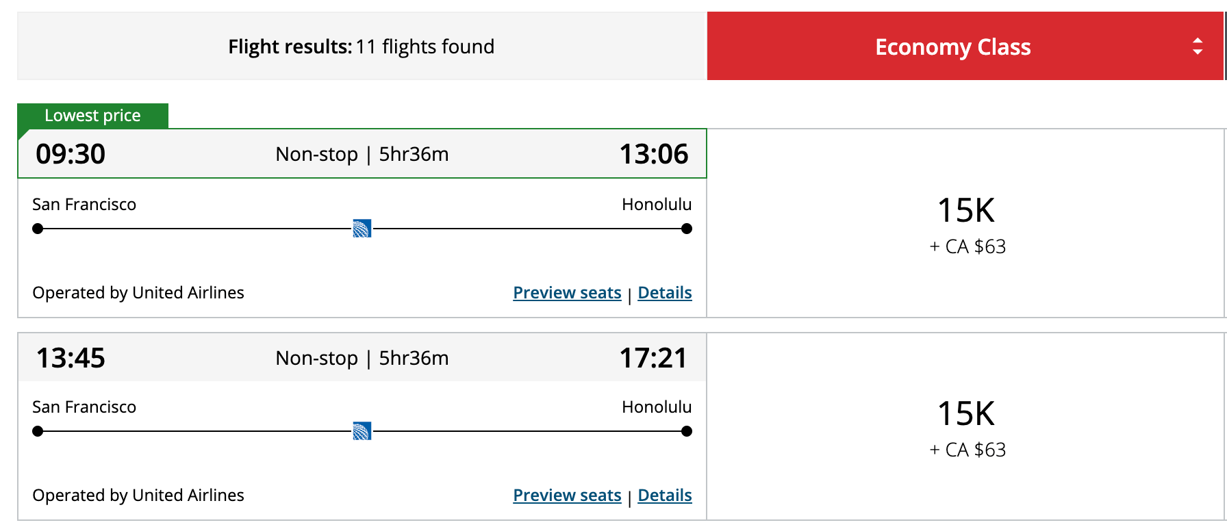 You can even use Aeroplan to book domestic flights on United. Tbh, the pricing isn’t always the best. But if you’re flying somewhere like Hawaii, there are some good deals when you throw in this 20% transfer bonus.