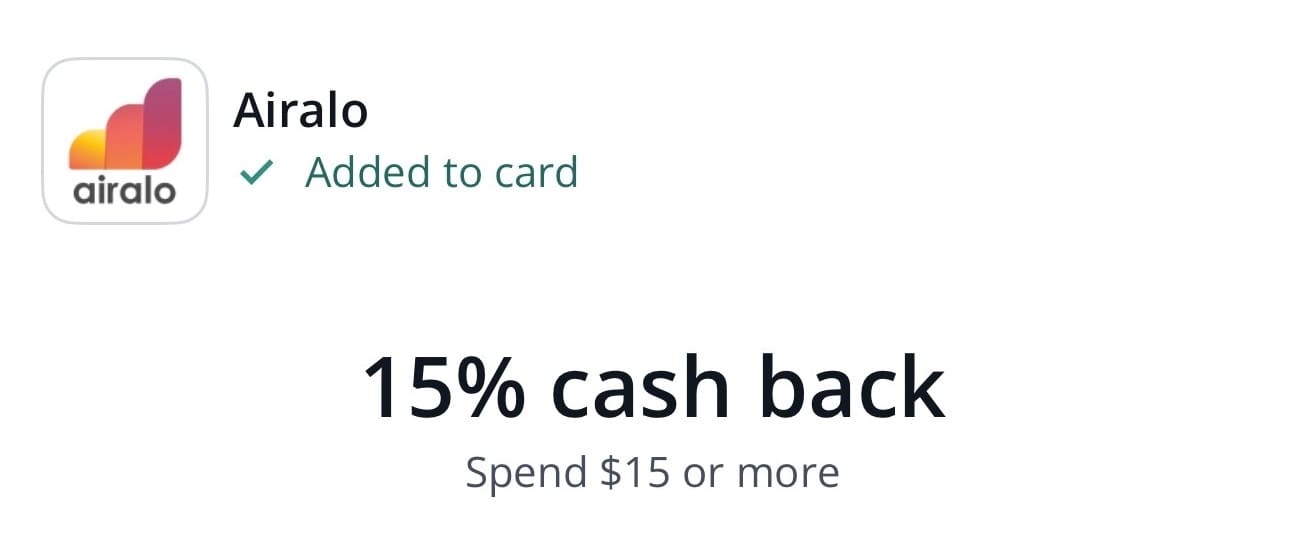 For starters, I find that there’s always a card with some kind of merchant offer for Airalo. In fact, when I bought the China data package I’m currently using, I used this offer for 15% back on this card.