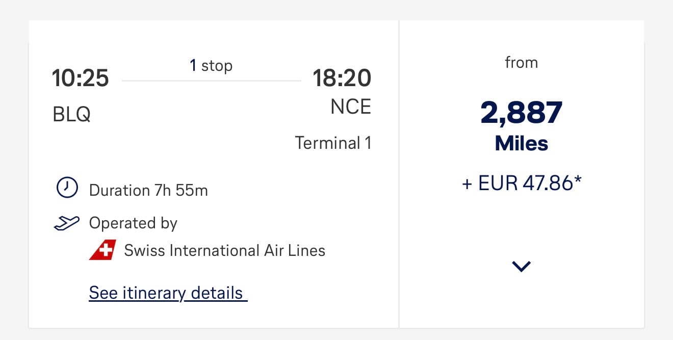For example, I just flew from Bologna to Nice last week using Lufthansa miles. It was about 2,800 miles and around $50 in fees to fly Swiss via Zurich.