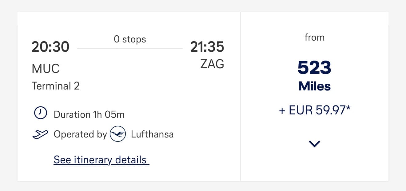 This nonstop Lufthansa flight from Munich to Zagreb costs 523 miles and about $60.