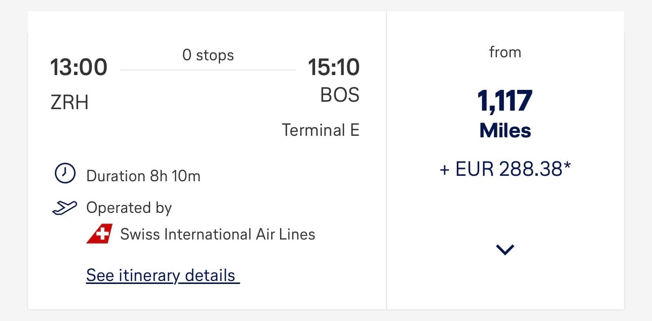But what you can control is how many miles you’re using. For example, this nonstop flight from Zurich to Boston costs just over 1,000 miles in economy. 👇