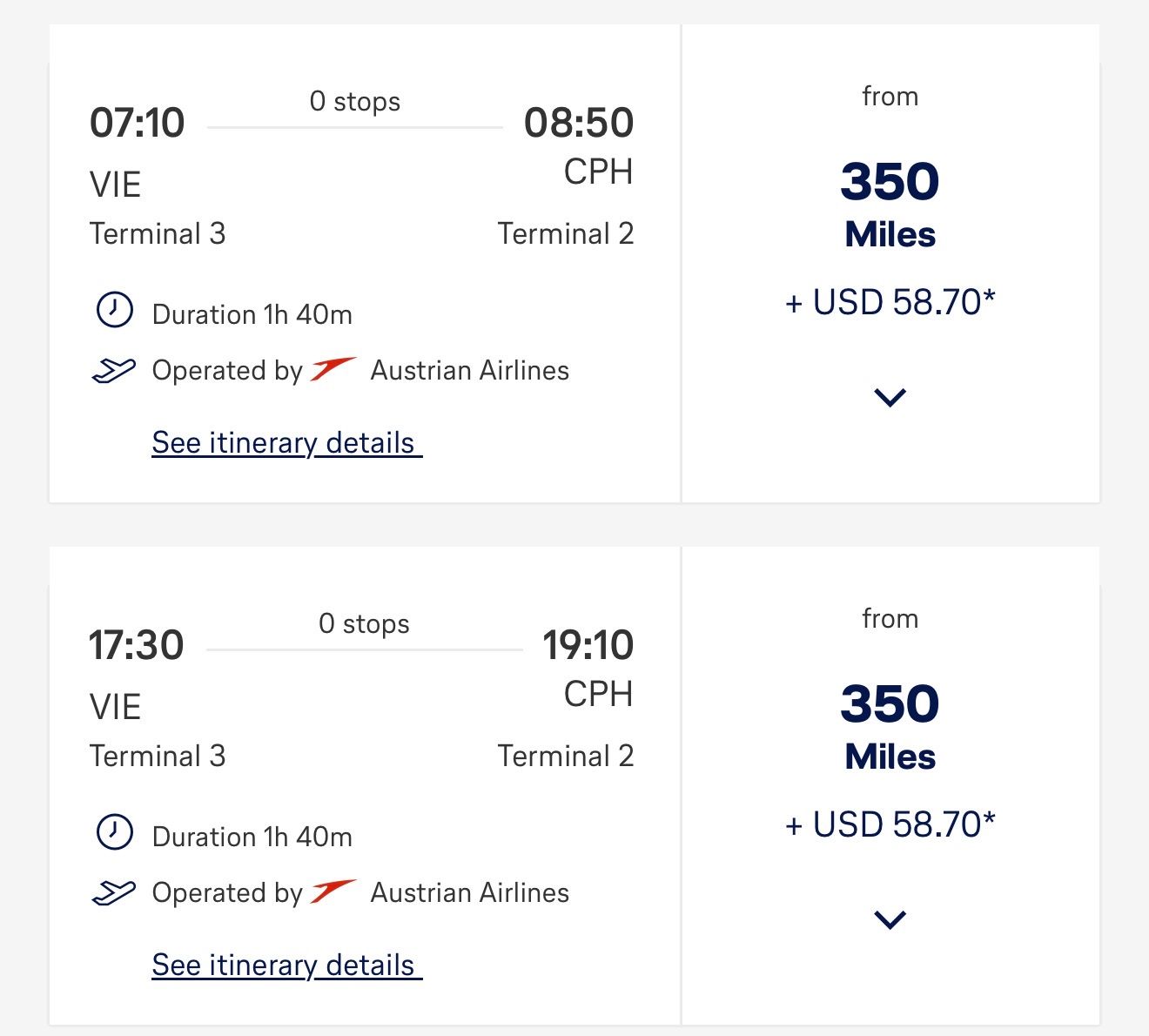 For example, let’s say you want to plan a trip to Austria and Scandinavia. Flights between Vienna and Copenhagen cost just 350 miles and about $60 in fees.