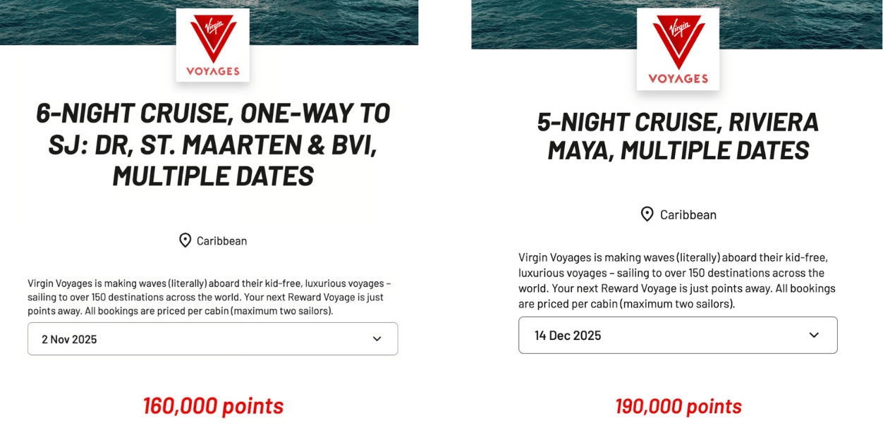 But where this gets even sweeter is that until October 18, there’s a 30% transfer bonus from ThankYou points to Virgin Atlantic. That means you’d only need 124,000 ThankYou points for that Caribbean cruise, or 147,000 points for the Riviera Maya sailing.