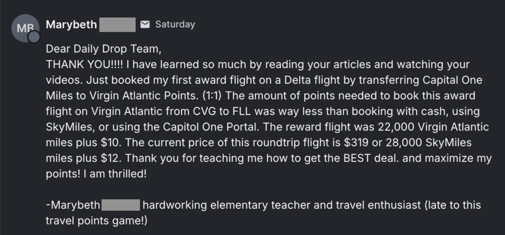 We got a fun email from a Daily Drop reader named Marybeth the other day. She reached out to tell us about a solid points redemption she was excited about: